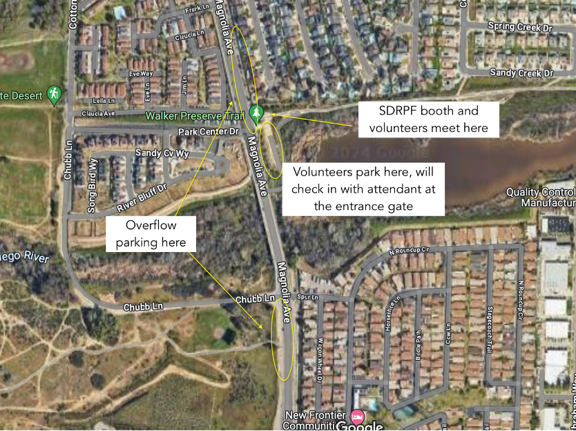 Park & Meet: Park at the Walker Preserve Trailhead at 9500 Magnolia Ave, Santee, CA 92071. Please allow for extra time as parking will be limited. There is overflow parking along Magnolia Ave and you can also park in the dirt strip on the corner of Chubb Ln and Magnolia, but note Chubb Lane is closed to traffic.